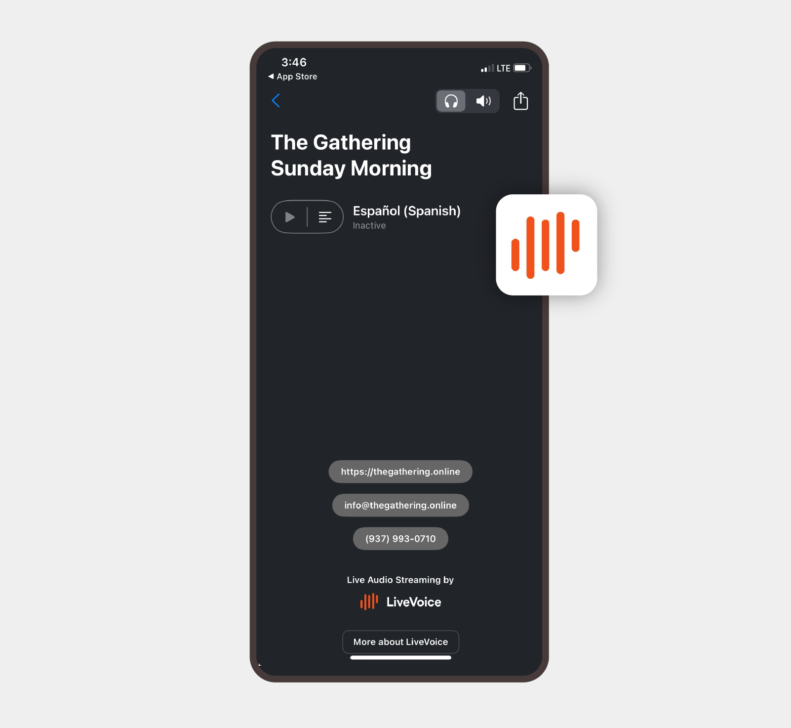 Para escuchar el servicio matutino en español, se ofrece servicio de traducción a través de LiveVoice, una aplicación móvil gratuita. Se pueden solicitar auriculares prestados en el vestíbulo de la iglesia.